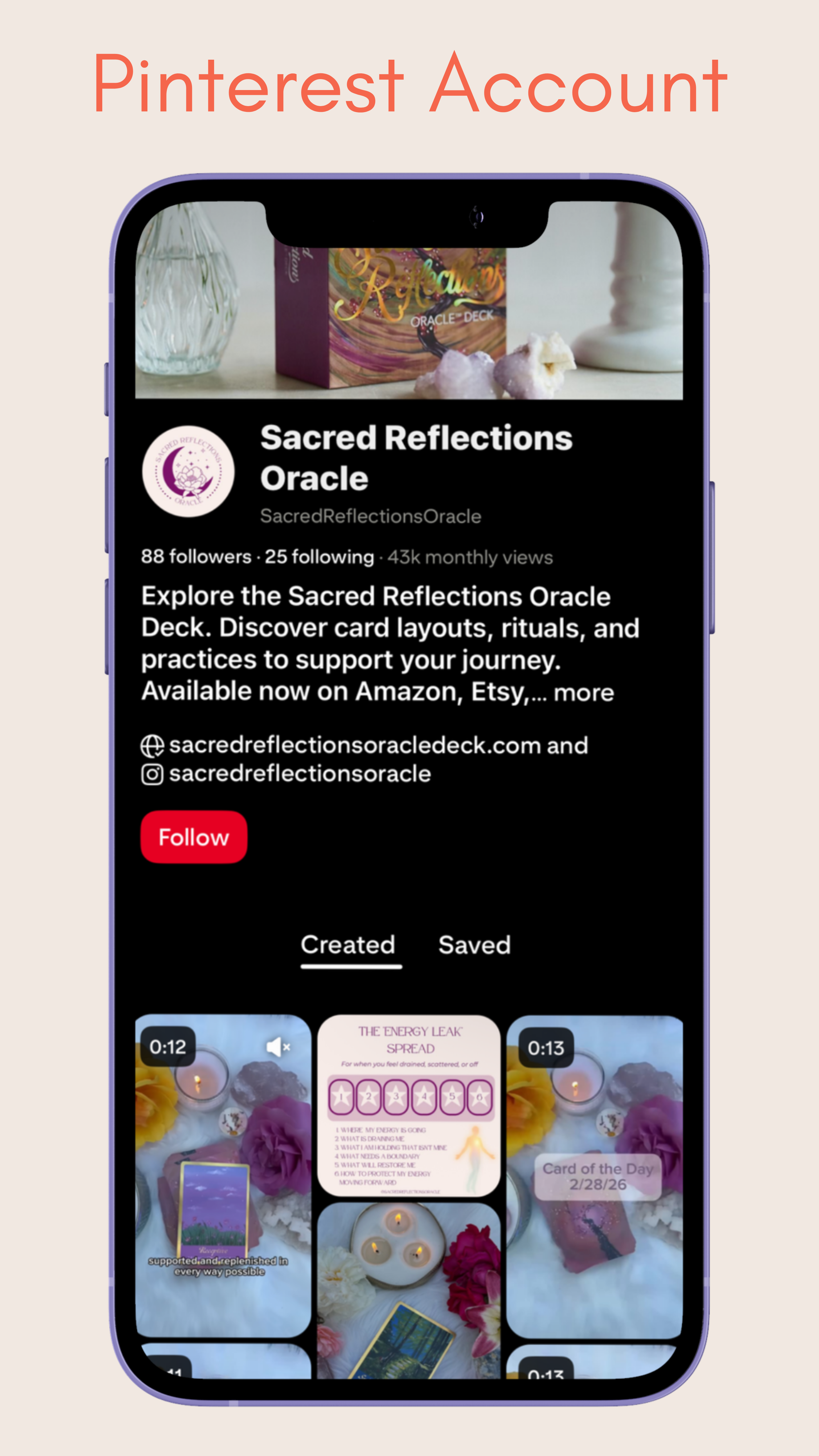 For Sacred Reflections Oracle, I fast-tracked the brand’s digital audience by establishing a presence on Facebook, TikTok, Instagram, Youtube and Pinterest in order to reach our target demographic.